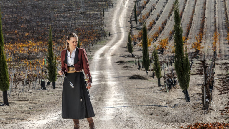 Full body of pensive young female venenciador in long skirt and maroon short coat looking down while standing on road with venencia and glass in hands in sunny daylight against vineyard